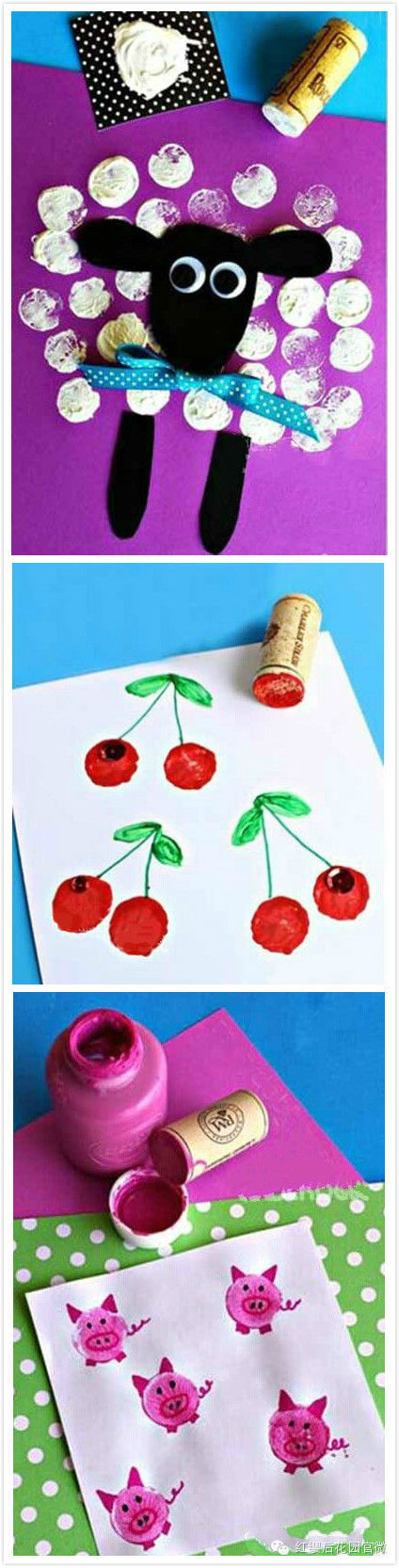 红酒软木塞摇身一变,成为孩子小手容易抓握的拓印工具,红色的甲壳虫,胖胖的小猪脸,诱人的樱桃......在孩子丰富的想像世界里,这个软木塞的圆点印记,可以弄出N多种变化。