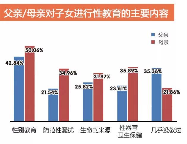在一次有关性健康教育的座谈会上,有人问国家卫生计生委的一位领导:“当您的孩子进入青春期时,您给孩子讲过性知识吗?”领导犹豫了一下说:“我的孩子是男孩,没讲过,主要是难以启齿,但我家有很多书,孩子会通过看书获得知识。” 在你们家,谁开口跟孩子谈性,爸爸还是妈妈?还是爸爸跟儿子谈,妈妈跟女儿谈?调查显示,从家庭性教育的性别差异来看,母亲比父亲起更为重要的作用,女生比男生接受性教育的机会更多。 调查显示,在家庭里面,一般是母亲进行性教育多一点,开口谈“性”也更容易一点。母亲几乎未对子女进行过性教育的比例(占21.86%)低于父亲(占35.36%),而认为进行性教育没什么阻碍的母亲(占25.28%)所占比例又高于父亲(占16.93%)。此外,母亲对子女进行过2项及以上性教育内容的比例(占46.84%)也高于父亲(占33.11%)。可见,母亲在性教育方面比父亲做得更好。