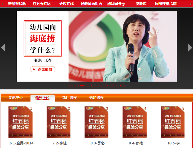 红缨教育搭建的网络平台,将一些共性的、其他连锁幼儿园咨询过的问题呈现在网站上,为连锁园园长提供一个庞大的知识库。只要园长登录这个网络平台,必定收获满满。每月工作提示、全年大型活动策划、每月工作重点,都将在这个网络平台上面向全国连锁园发布。同时,总部在幼儿园加盟伊始即帮助连锁园在这个平台上开通一个幼儿园网站,为连锁园提供一个网上展示的平台。