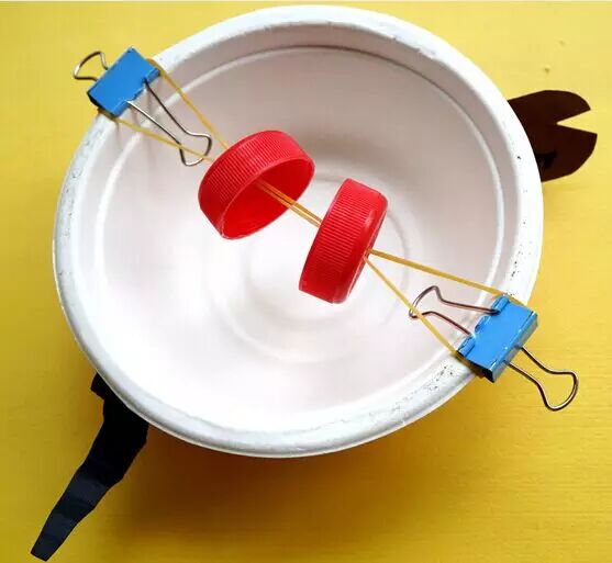 一次性纸碗、橡皮筋、两个钻好孔的瓶盖、两个铁夹子、橡皮泥、颜料、彩色纸。