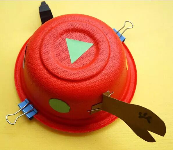 1.用颜料涂饰一次性碗做乌龟的身体,并在“乌龟”身体的两端钉上用彩色纸制作的头和尾巴。