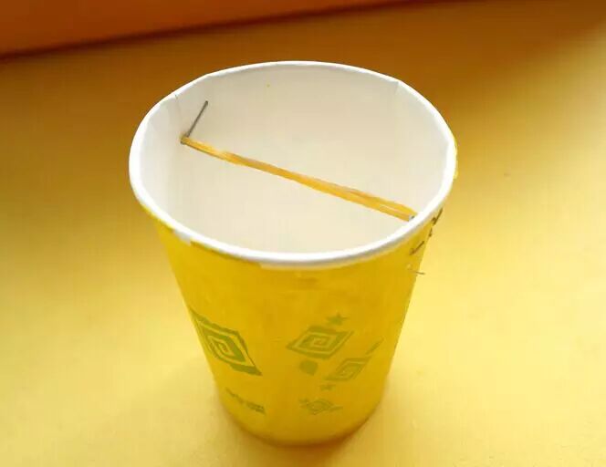1.用颜料涂饰一次性纸杯,用订书针将一根橡皮筋固定在这只纸杯口子的两端。