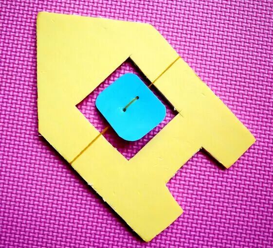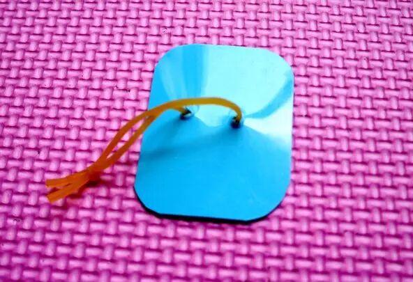 3.将橡皮筋剪开变成长条,从塑料片的一个孔穿入并从另一个孔穿出,然后将橡皮筋两端打结。