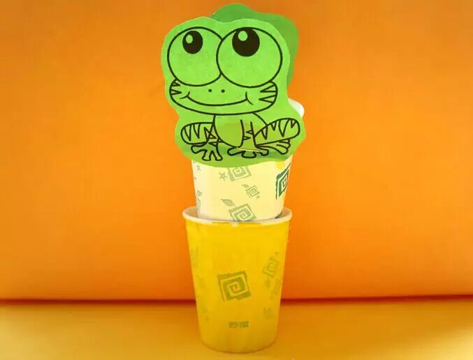 3.将钉有“青蛙”的杯子放在装有橡皮筋的杯子上。
