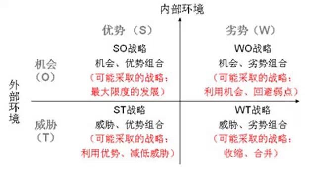 SWOT可分为两部分。第一部分为SW,主要用来分析内部条件。第二部分为OT,主要用来分析外部条件。每一个单项如S又可以分为外部因素和内部因素。