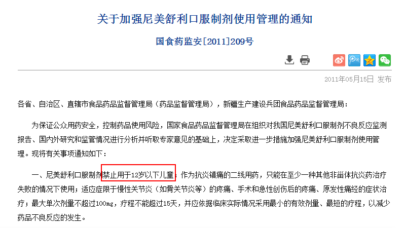 2011年,我国药监局就已经发出公告,禁止尼美舒利用于12岁以下的儿童。